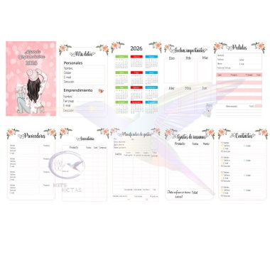 Agenda tamaño 14 x 21.5 cms. Incluye: Datos personales, calendario 2026, apartado para fechas importantes, metas del año, pedidos, proveedores, inventario, planificador de gastos, gastos de insumos, contactos, contraseñas, notas.